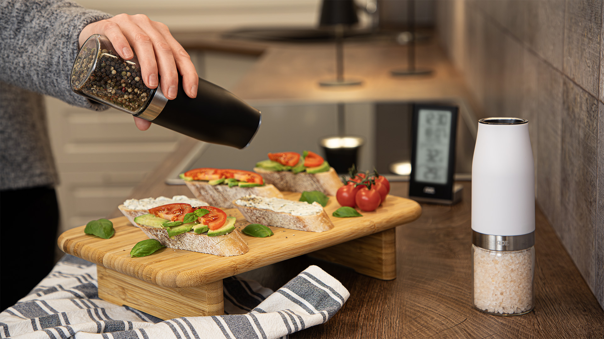 Our electric salt and pepper mills deliver freshly ground spices at the push of a button. Featuring high-quality ceramic grinding mechanisms and adjustable grind settings, they ensure a personalized flavor. An LED light activates during grinding, perfectly illuminating the amount of seasoning.