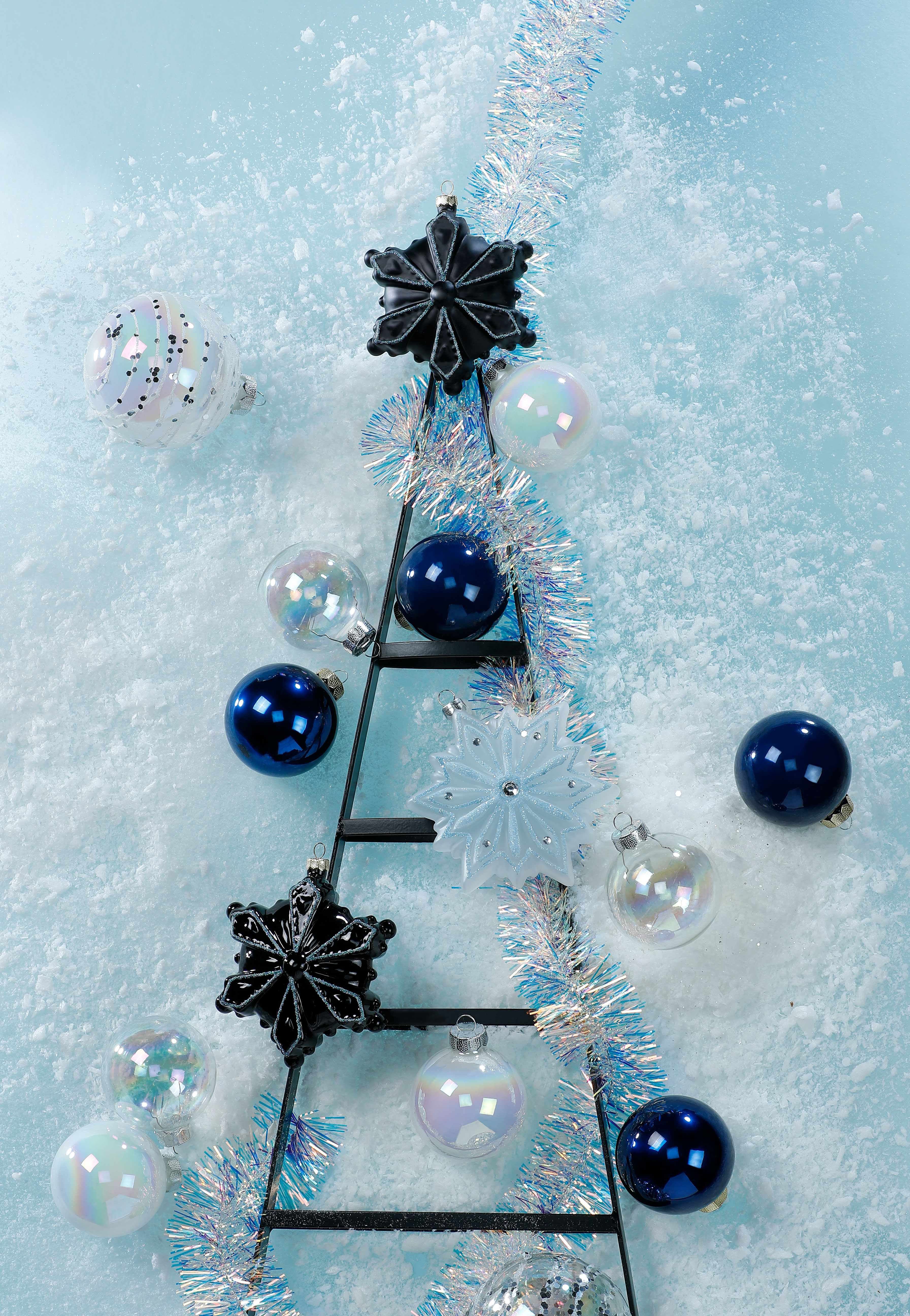 Immerse yourself in a magical Christmas scene that captures the frosty beauty of a glittering winter morning. Deep dark blue and black merge with soft ice blue, radiant white and iridescent accents that look like sparkling ice crystals. Dark, textured glass spheres meet delicate snowflake ornaments and create a fascinating interplay of light and shadow. Finely incorporated patterns, inspired by idyllic snowy landscapes, lend the decoration a magical winter atmosphere. Shiny accents in silver and chrome create sophisticated highlights and bring a cool, modern elegance to your decor. Ideal for anyone who wants to enjoy the festive season in a stylish, contemporary ambience.