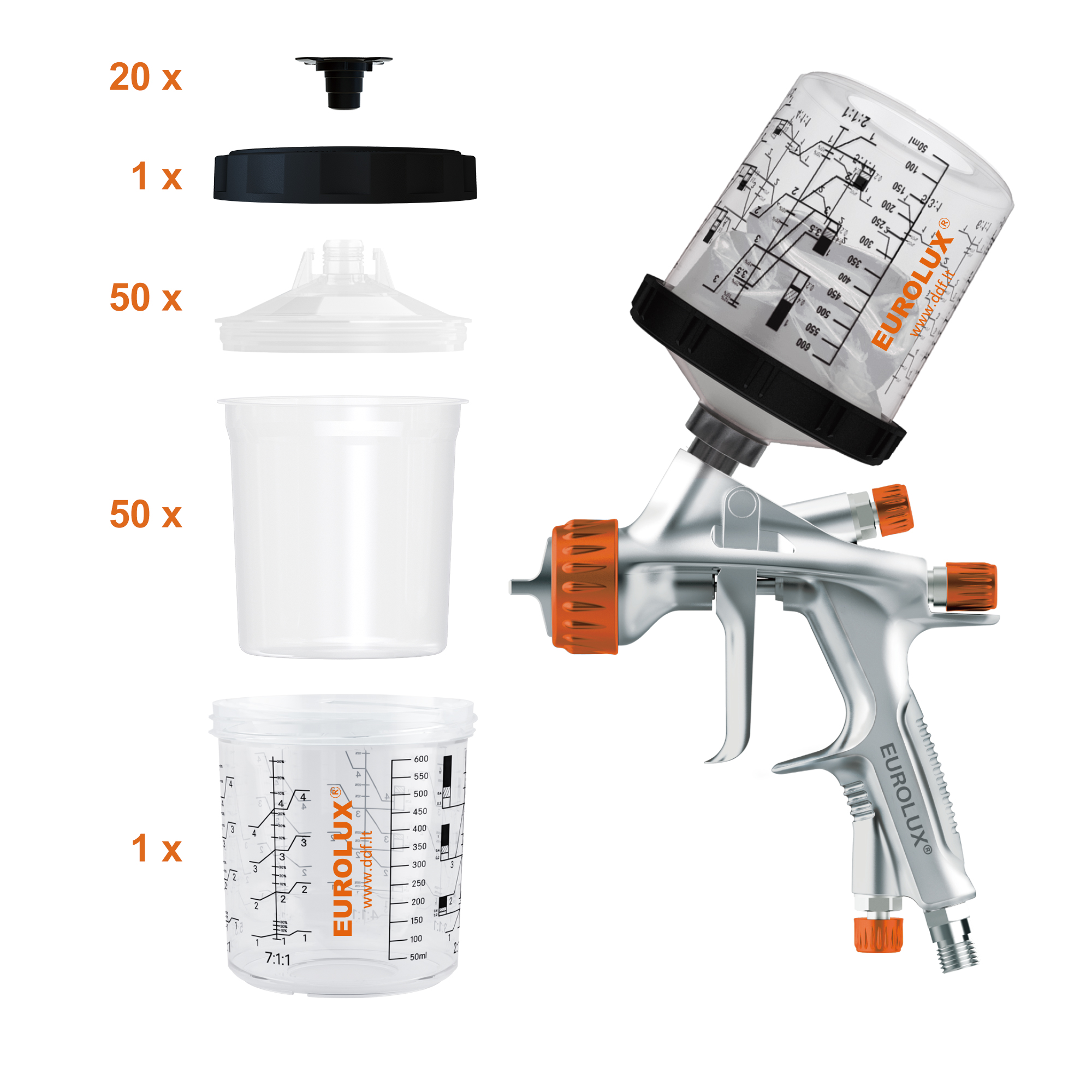 The Eurolux Paint Cup System is a very efficient paint processing system. This system replaces traditional mixing cups and paint strainers. By making and spraying the paint in the same liner, the working and cleaning time are drastically reduced. The System also allows to spray 360° in every difficult angle. Available in 180 ml, 400 ml, 650 ml and 850 ml.